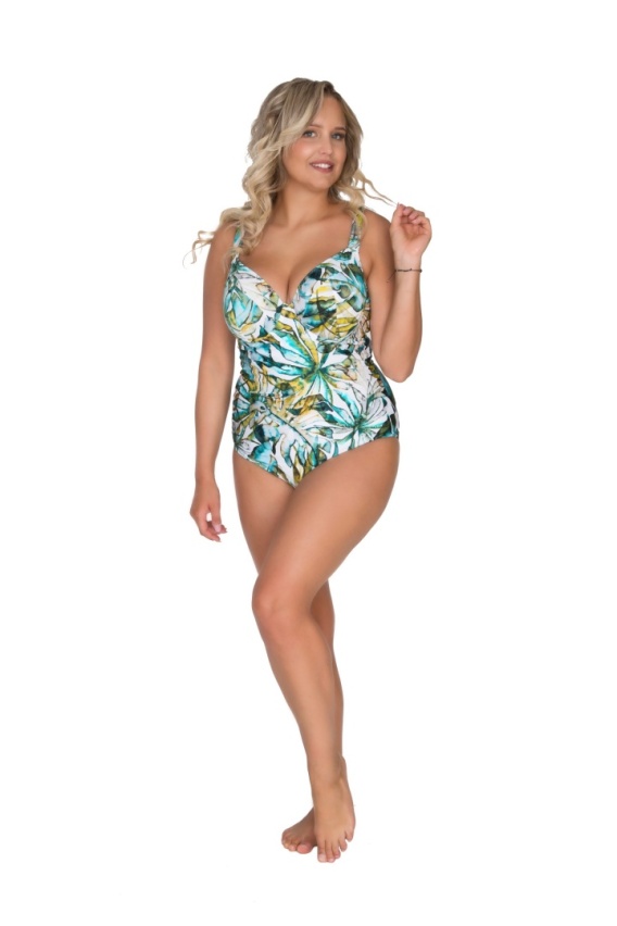 Ten jednoczęściowy strój kąpielowy to harmonijne połączenie modnego designu i komfortu noszenia. Efektowny, roślinny print w odcieniach zieleni, turkusu i delikatnej bieli nadaje mu świeżości oraz egzotycznego charakteru, pięknie podkreślając letnią opaleniznę. Starannie zaprojektowany fason subtelnie modeluje sylwetkę, eksponując atuty figury i dodając pewności siebie na plaży oraz basenie.