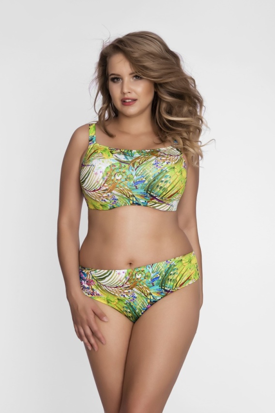 Odkryj idealne połączenie wygody i kobiecego stylu dzięki naszemu wyjątkowemu kompletowi kąpielowemu! Biustonosz o usztywnianych miseczkach zapewnia doskonałe podtrzymanie i modeluje biust, a szerokie ramiączka gwarantują komfort noszenia. Całość ozdobiona jest tropikalnym wzorem w odcieniach zieleni, różu i bieli, który podkreśla letni klimat.