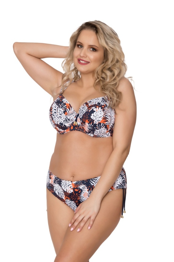 Ten dwuczęściowy strój kąpielowy to połączenie modnego wzornictwa i kobiecej elegancji. Dynamiczny, tropikalny print liści w kontrastowych barwach granatu, bieli i pomarańczy przyciąga wzrok i doskonale podkreśla letnią opaleniznę. Biustonosz typu soft z delikatnym marszczeniem i ozdobnym akcentem przy dekolcie subtelnie eksponuje biust, nadając całości nowoczesnego charakteru.
